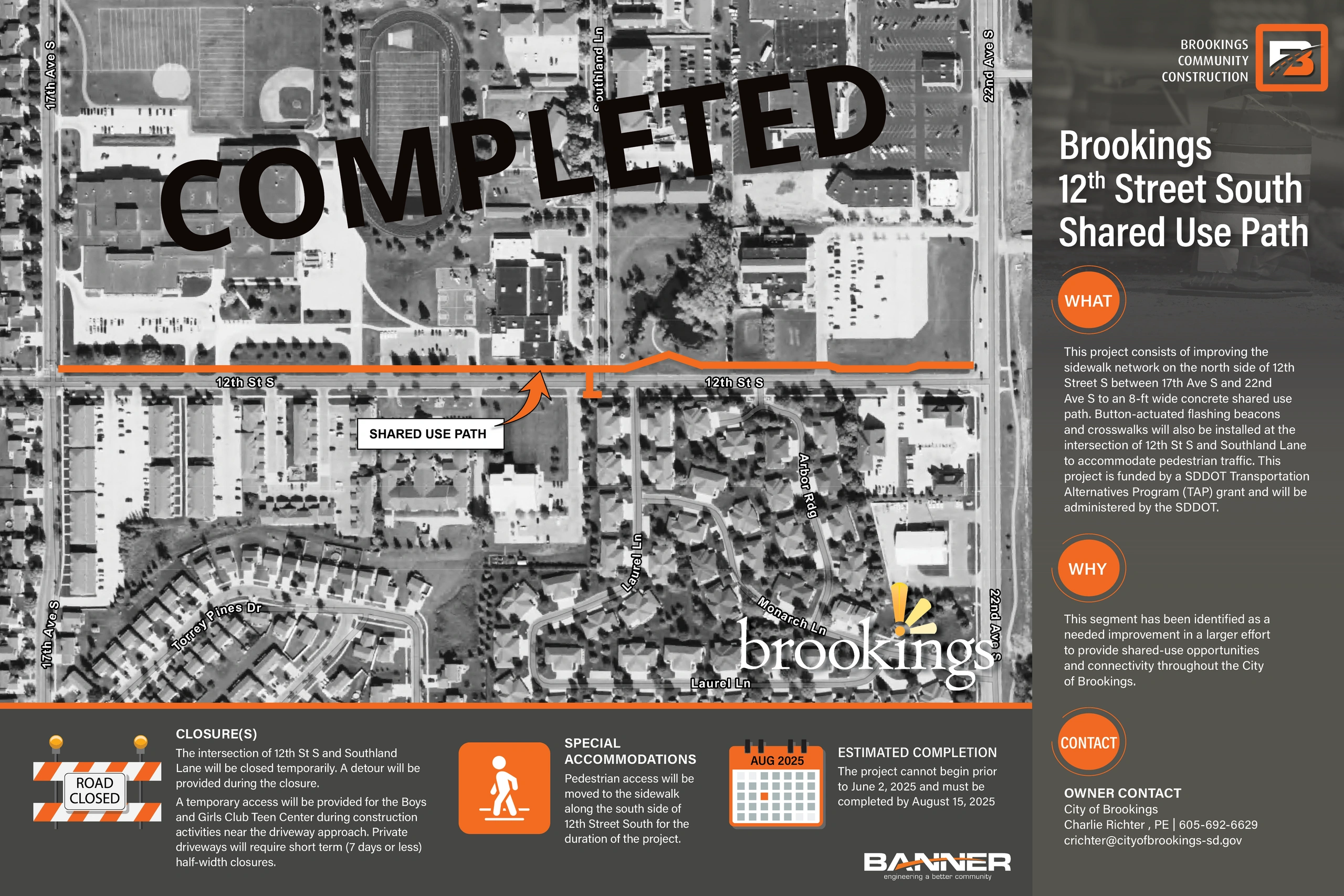 Beginning on Tuesday, May 27, 2025, work will begin on a shared use path along 12th Street South in Brookings. The work will be conducted between 22nd Avenue South and 17th Avenue South. Pedestrian crossing improvement operations will also be conducted at the Southland Lane intersection as part of this project.