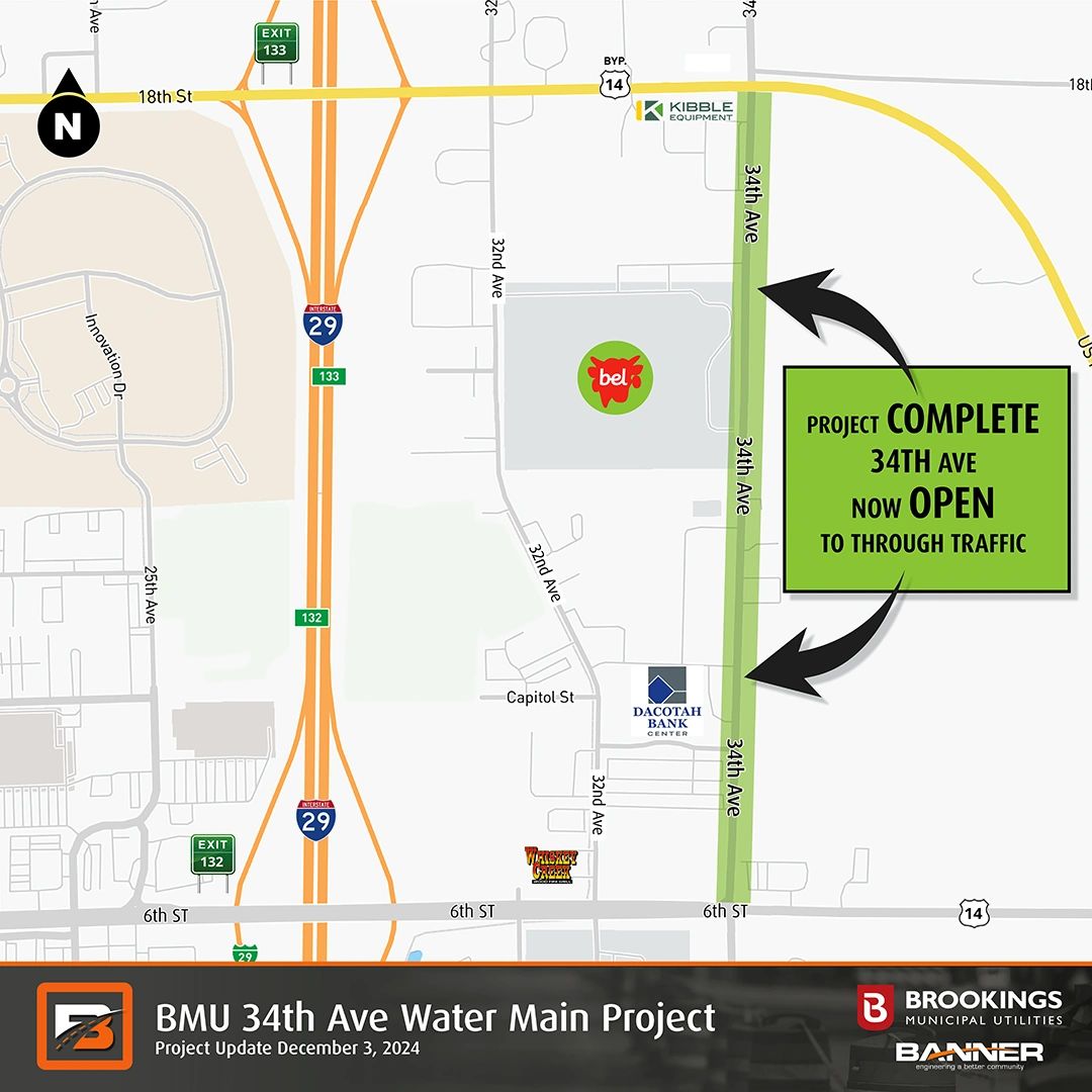 Brookings Municipal Utilities is installing new watermain and upsizing the existing sanitary sewer main on 34th Ave from just south of 6th St to the Hwy 14 Bypass. This segment of 34th Ave will be reconstructed.