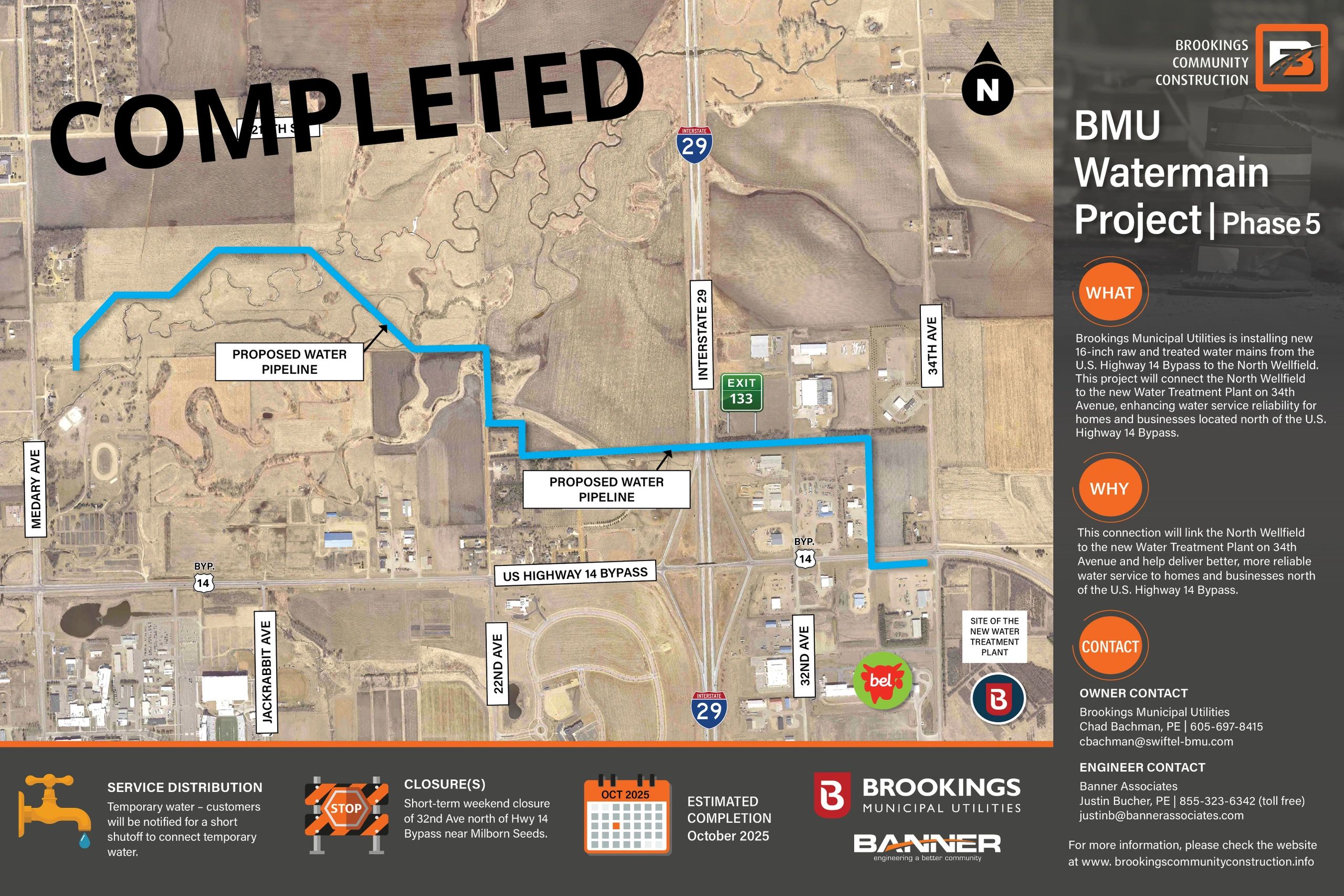 Brookings Municipal Utilities (BMU) continues construction efforts on Phase 5 of the Watermain project, installing a new 16” raw and treated water main from US Hwy 14 Bypass to the north wellfield. This will connect the north wellfield to the new water treatment plant on 34th Ave, enhancing water service for homes and businesses north of the bypass.