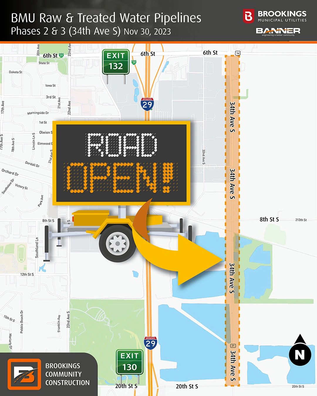 On Wednesday April 12, 34th Avenue S in Brookings will be closed for watermain construction from 20th Street S to 8th Street S. A detour for through traffic is planned on SD Hwy 324 (217th St), I-29, and 6th Street. Access will be maintained for local businesses. 34th Avenue S will remain closed until further notice.