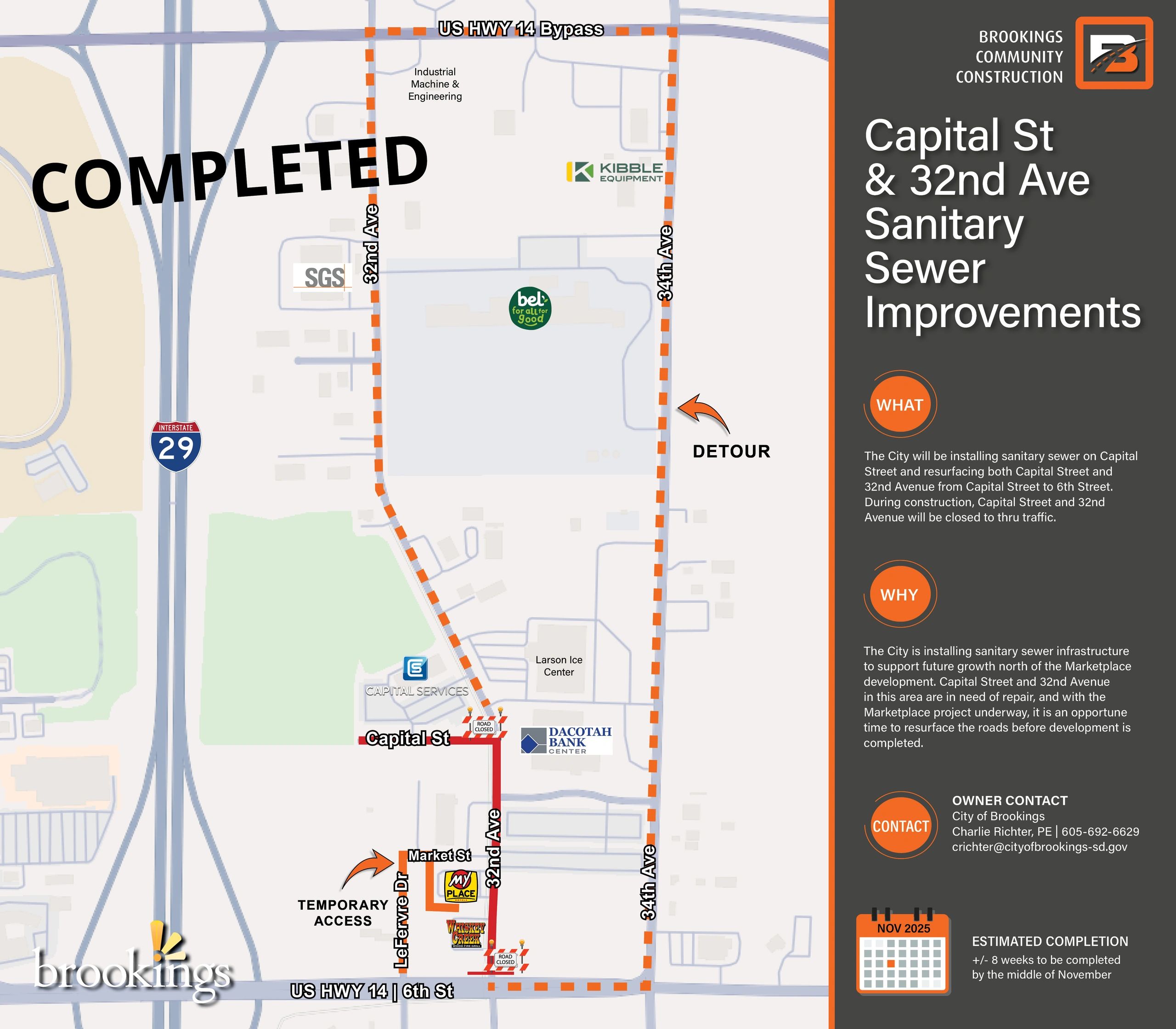 Beginning October 17, 32nd Avenue from 6th Street to Market Street will reopen to local traffic. Access to Whiskey Creek and My Place Hotel will remain available from the north side of the My Place Hotel parking lot, via Market Street. LeFervre Drive will now be closed to thru traffic. Please follow all posted signage when traveling to these businesses. Your cooperation ensures safety and helps maintain smooth traffic flow during this phase of the project.