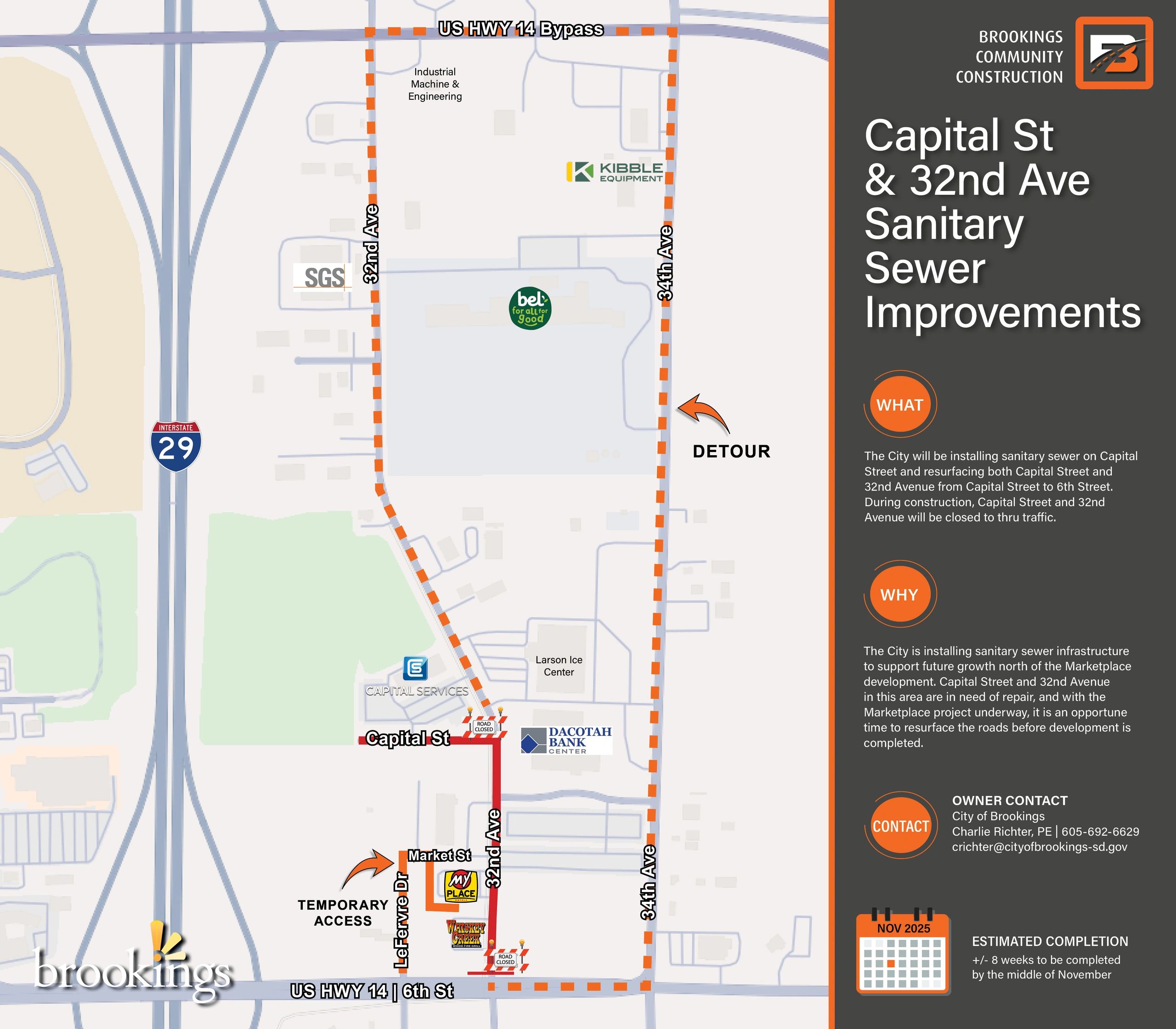 Starting September 22, the City will begin installing sanitary sewer on Capital Street and resurfacing both Capital Street and 32nd Avenue from Capital Street to 6th Street. These improvements support future growth north of the Marketplace development and address needed road repairs in the area. During construction, Capital Street and 32nd Avenue will be closed to thru traffic, with detours provided to maintain access to nearby businesses.